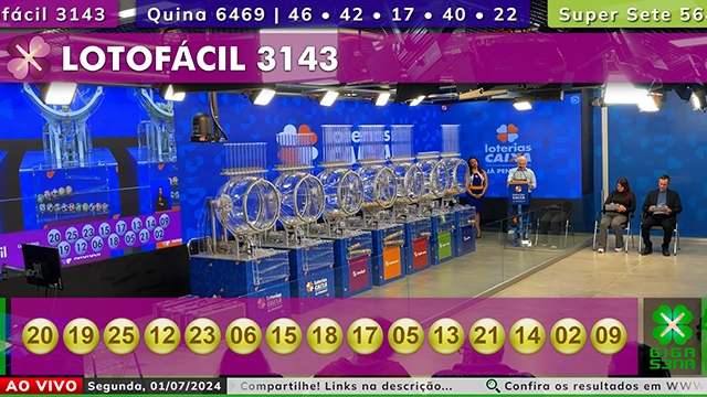 Os números sorteados no concurso da Lotofácil 3143 foram divulgadas às 20:20 horas do dia 01 de julho de 2024, segunda-feira, e o primeiro prêmio foi a R$ 1.700.000,00 (um milhão e setecentos mil reais).