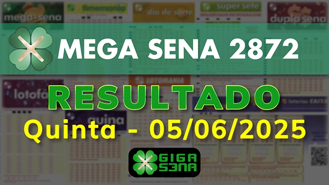 O concurso 2872 da Mega Sena teve os números divulgados às 20:03 horas do dia 05 de junho de 2025, quinta-feira, e o primeiro prêmio alcançou a quantia de R$ 44.065.911,95 (quarenta e quatro milhões, sessenta e cinco mil e novecentos e onze reais e noventa e cinco centavos).